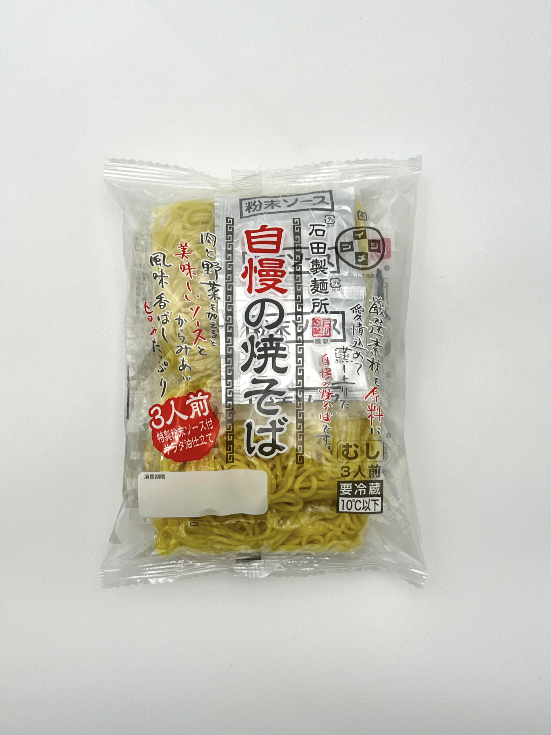 毎日の食卓にうれしい三食入り。イシメン特性ソースと蒸し製法由来のもっちりハリのある麺で、飽きのこないおいしさです。